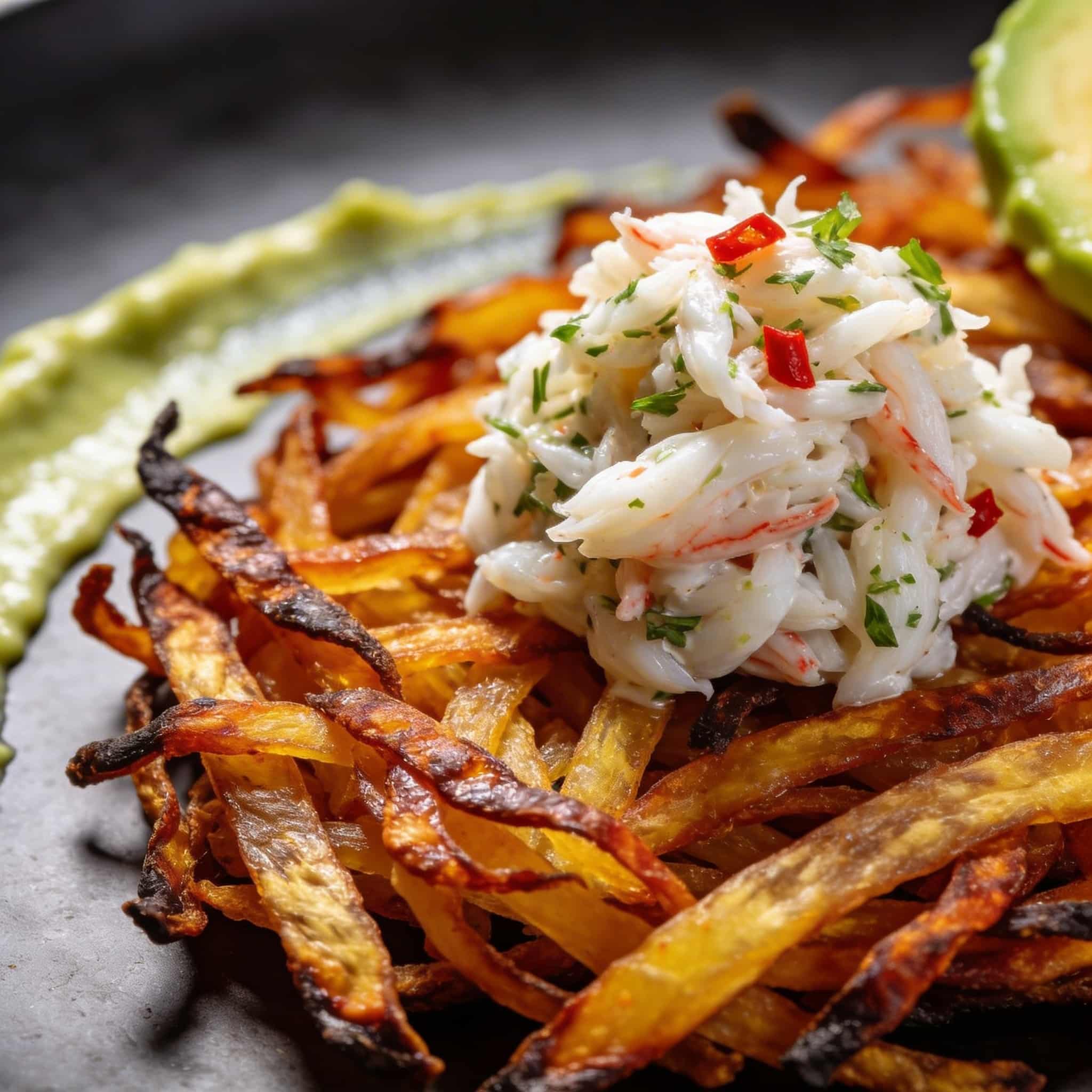 - Serve the hot pepper avocado on the plate, top with the warm rostis, then finish with generous spoonfuls of the crab salad.