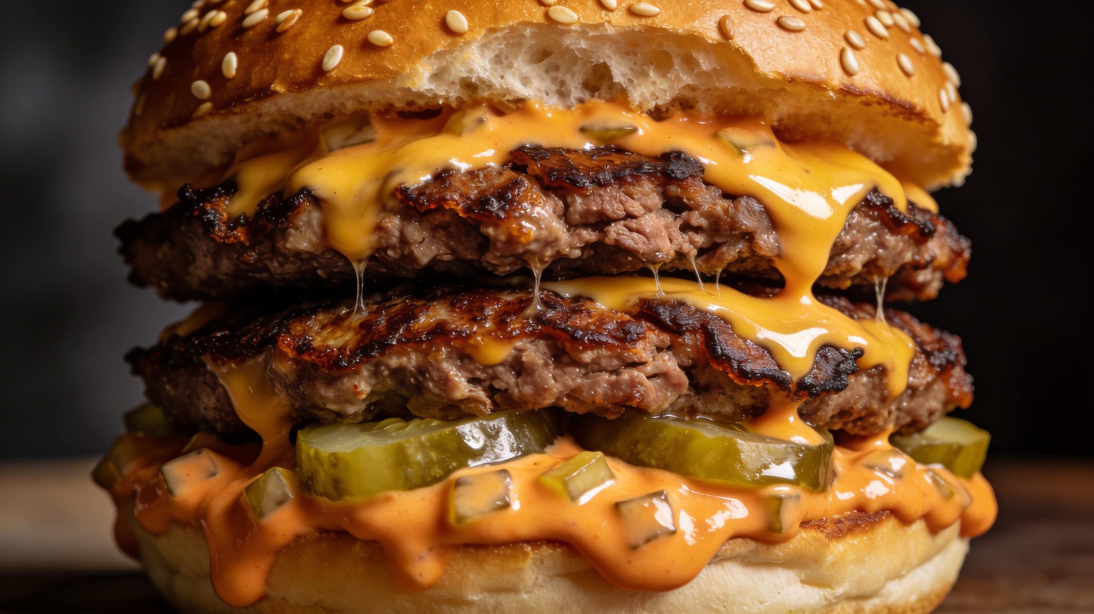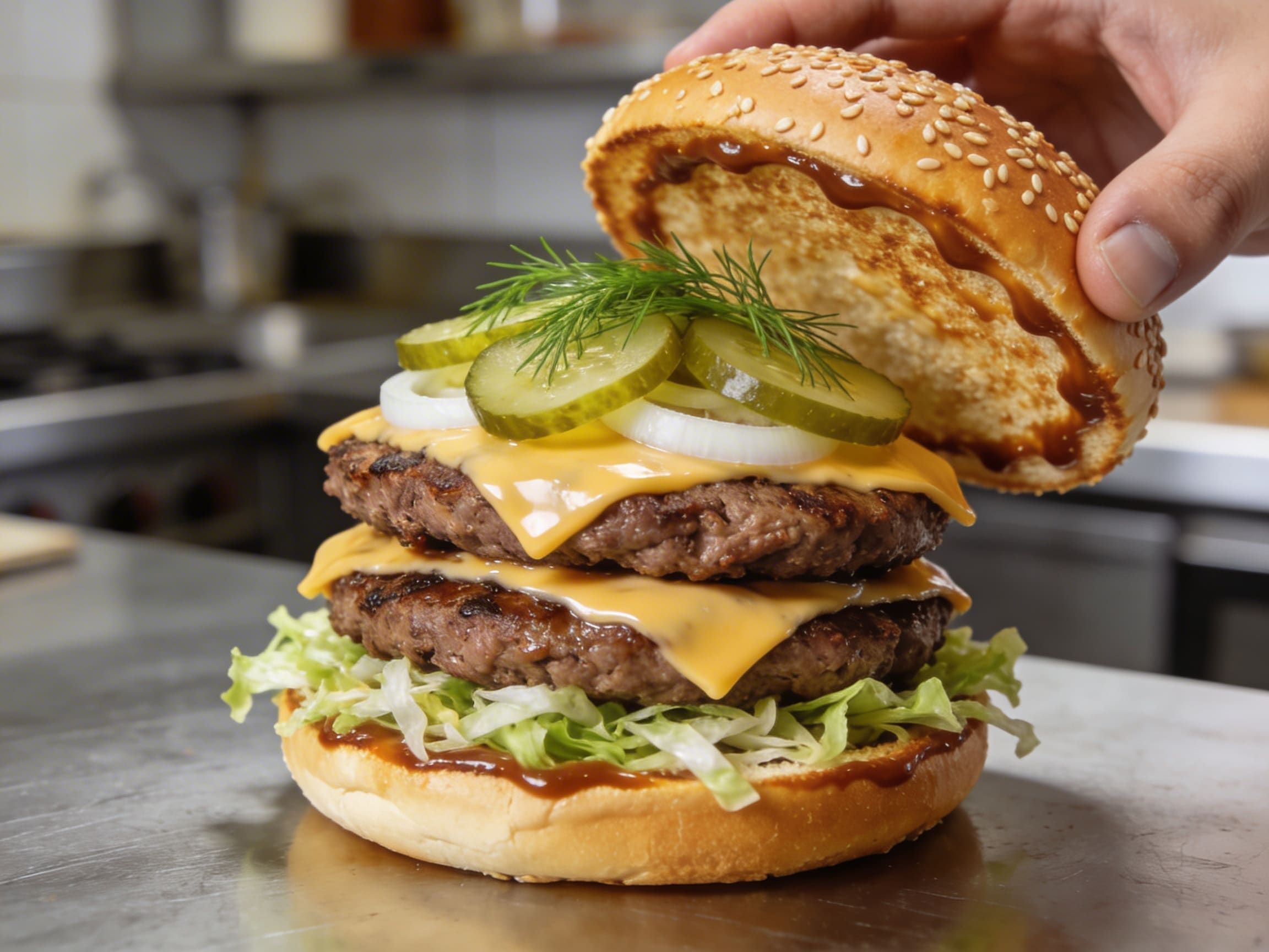 - Build and serve: Spread burger sauce generously over both cut sides of each bun. Place a little shredded lettuce on the base, then stack two patties per burger, cheese side up. Top with more shredded lettuce, finely diced white onion, and a few slices of dill pickle. Close the bun and serve immediately.