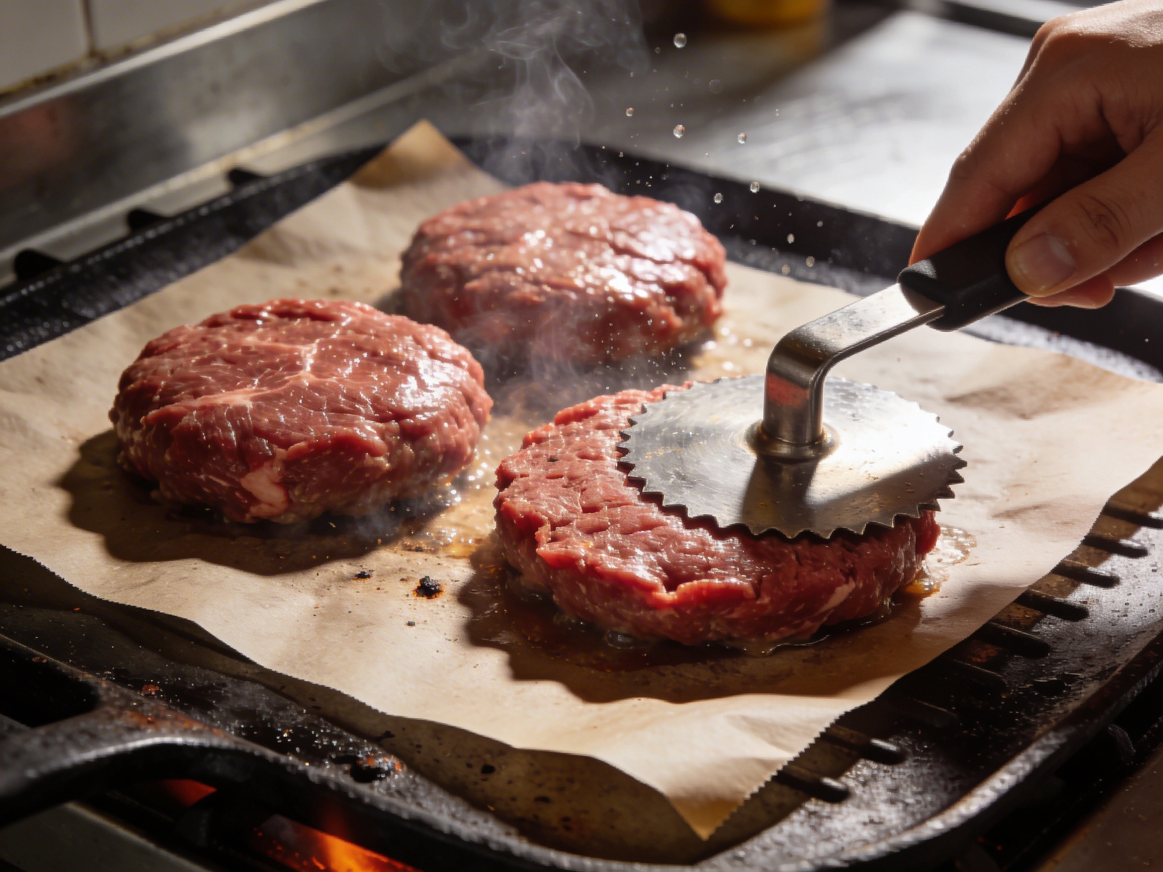 Scrape, don’t lift: When flipping, use a thin, rigid metal spatula and scrape—do not lift—the patty off the surface. The caramelised crust will try to stick; scraping it clean off the pan is where all the flavour lives.