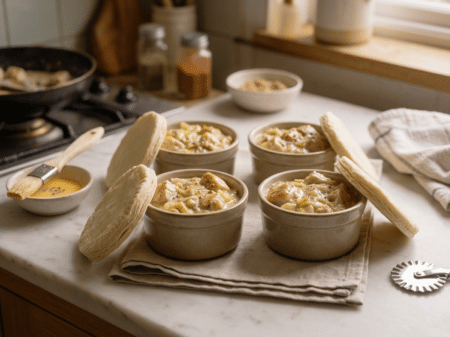 A comforting chicken and leek pie made with chicken thighs, leeks, peas, milk, and Ainsley Harriott Chicken and Leek Cup Soup, topped with puff pastry and baked until golden.