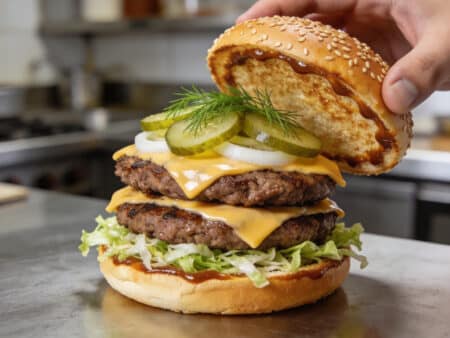 Crispy-edged double beef patties smashed thin on a screaming-hot pan, layered with melted burger cheese and a tangy homemade sauce, all stacked in a toasted seeded bun.