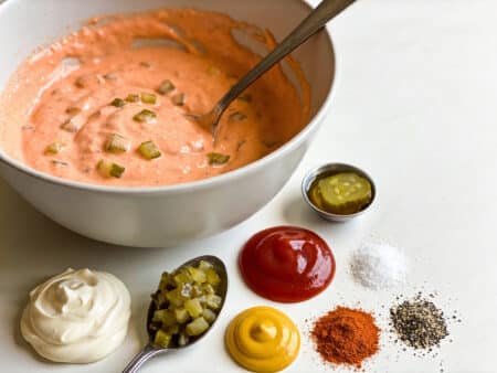 Mix the mayonnaise, finely diced gherkin, pickling juice, yellow mustard, ketchup, garlic powder, and smoked paprika in a bowl. Season with salt and pepper. Set aside.