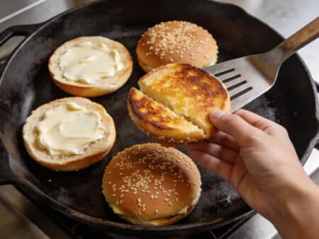 Brush the cut sides of the burger buns with mayonnaise and toast cut-side down in a pan over medium heat until golden. Remove and set aside.